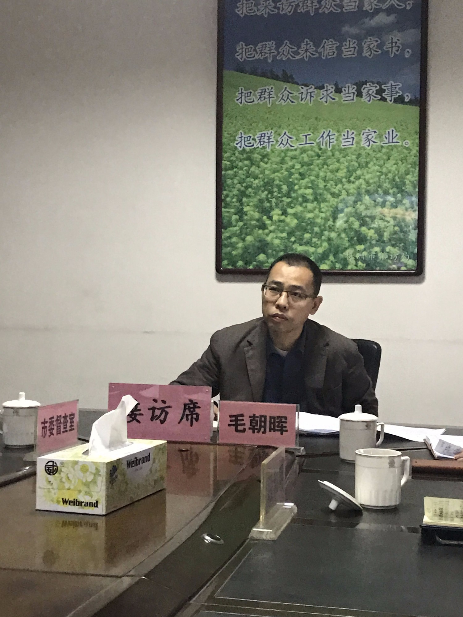 10月16日,株洲市委常委、市委秘书长毛朝晖到市信访局接访。市政府副秘书长、市信访局局长彭小中,市信访局党组成员贺亚兵、副局长段和明陪同。