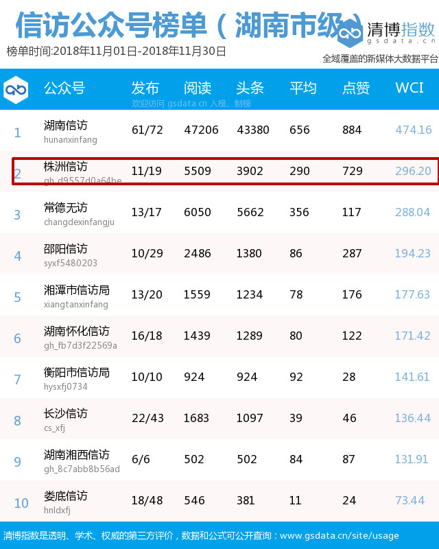 11月湖南信访系统微信公众号榜单出炉,恭喜 "株洲信访"名列全省市洲第一,恭喜!