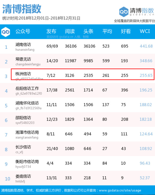 12月湖南信访系统微信公众号榜单出炉,恭喜 "株洲信访"名列全省市州第二!