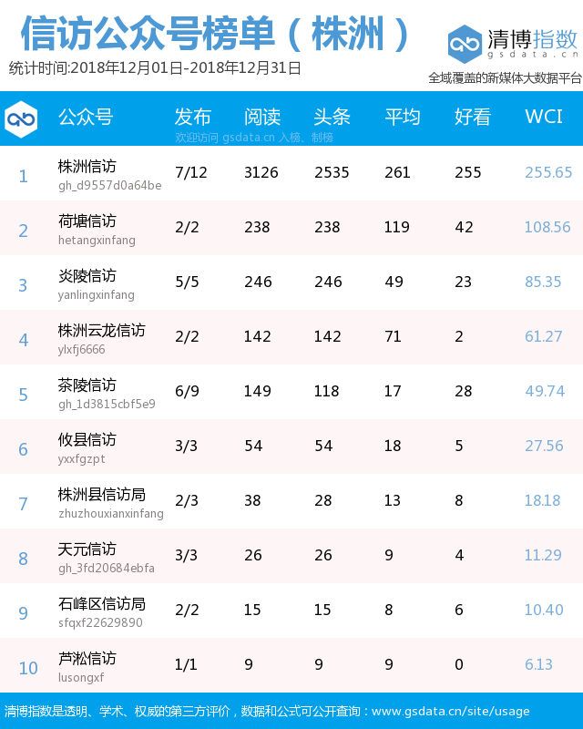 株洲信访系统微信公众号2018年12月榜单出炉,"荷塘信访"、"炎陵信访"、"株洲云龙信访"、"茶陵信访"分别位居第二、第三、第四、第五,恭喜!