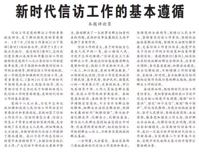 信访工作是党的群众工作的重要组成部分,是了解社情民意的重要窗口。4月7日,《信访工作条例》(以下简称《条例》)向社会公开,并将于5月1日起正式施行。通过制定《条例》,总结我们党长期以来领导和开展信访工作经验特别是党的十八大以来信访工作制度改革成果,对于坚持和加强党对信访工作的全面领导,理顺信访工作体制机制,进一步规范和加强新时代信访工作,具有重要意义。《条例》以习近平新时代中国特色社会主义思想为指导,深入贯彻习近平总书记关于加强和改进人民信访工作的重要思想,是新时代信访工作的基本遵循。