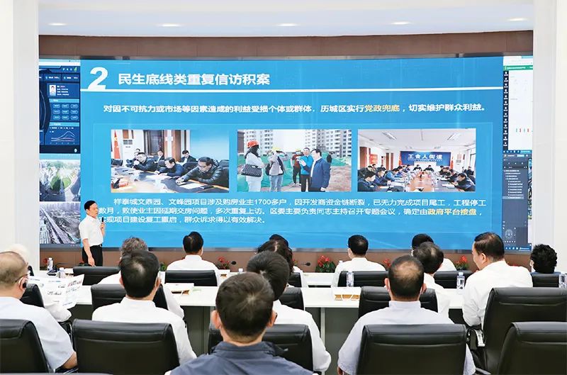 开展治理重复信访、化解信访积案工作,是推进解决信访突出问题、维护群众合法权益的重要举措。近年来,各地区各部门坚持问题导向、目标导向、结果导向,坚持治标与治本并重,最大限度减少问题产生和积累。2021年5月24日至25日,中央信访工作联席会议在山东省济南市召开"治理重复信访、化解信访积案"经验交流暨工作推进会。图为与会人员参观济南市历城区社会矛盾多元调处化解中心,了解信访积案化解情况。国家信访局供图