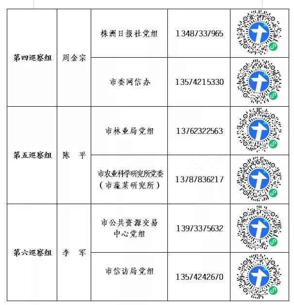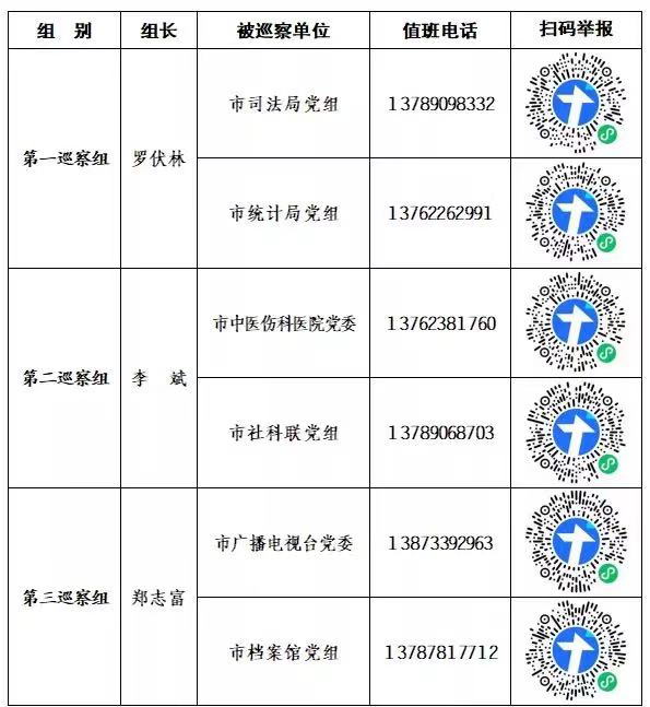 巡察期间,各巡察组设专门值班电话、征求意见箱等,受理反映被巡察党组织领导班子及其成员、市委管理的其他干部及下一级主要负责人、重要岗位主要负责人等问题的来信来电来访,重点是违反政治纪律、组织纪律、廉洁纪律、群众纪律、工作纪律和生活纪律等方面的举报和反映。对其他不属于巡察受理范围的信访问题,将按规定转交有关部门处理。现将各巡察组的值班电话(接听时间为8:00至18:00),以及扫码举报"二维码"予以公布。