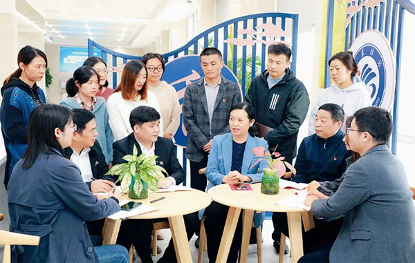 2022年11月22日,在江苏省常州市武进区人民来访接待中心,党的二十大代表与武进区信访局党员干部交流学习党的二十大精神体会,讨论如何在基层信访工作中抓好贯彻落实。 江苏省常州市武进区信访局供图 徐晶玮/摄