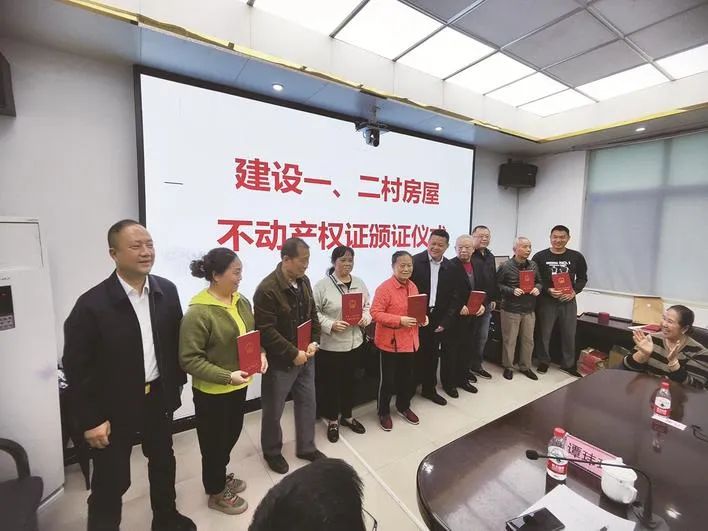 11月10日,在董家塅街道办,建设一、二村22户居民终于领到了心心念念的不动产权证。看着手里的大红色"房本",他们脸上都露出掩不住的笑意。