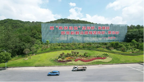 2023年8月7日,浙江诸暨,枫桥镇枫桥南高速出口"枫桥经验"宣传标语。(视觉中国)